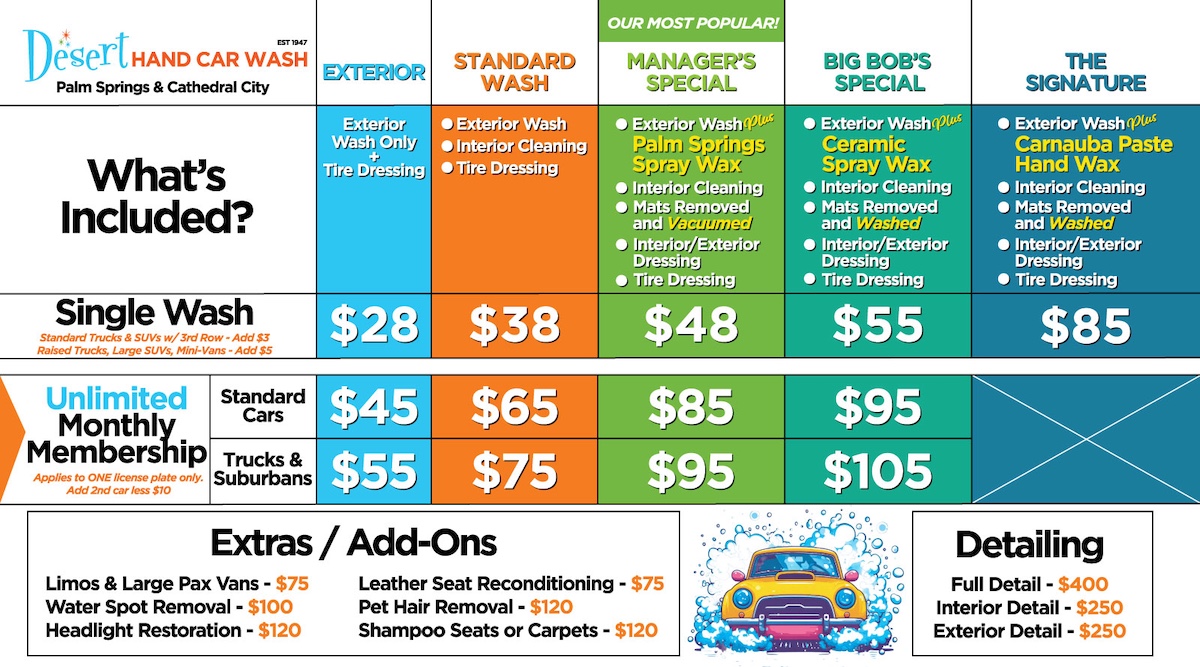 We pride ourselves for offering first class service at great prices. Visit our Palm Springs or Cathedral City Car Washes to restore that new car shine!